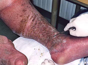 Man skal observere, om patienten viser tegn på et irritativt eller allergisk eksem i forbindelse med anvendte sårbandager, cremer m.v.